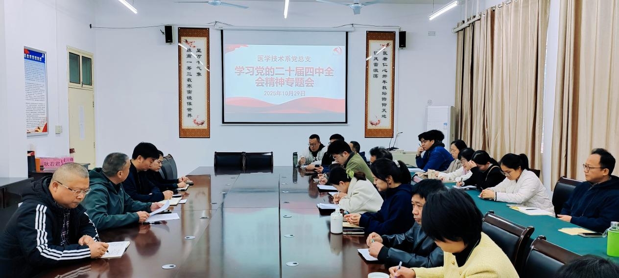 10月29日下午,医学技术系党总支在教学楼120会议室召开专题会议,学习党的二十届四中全会精神。会议由党总支书记钟俊主持,全体党员参加。
