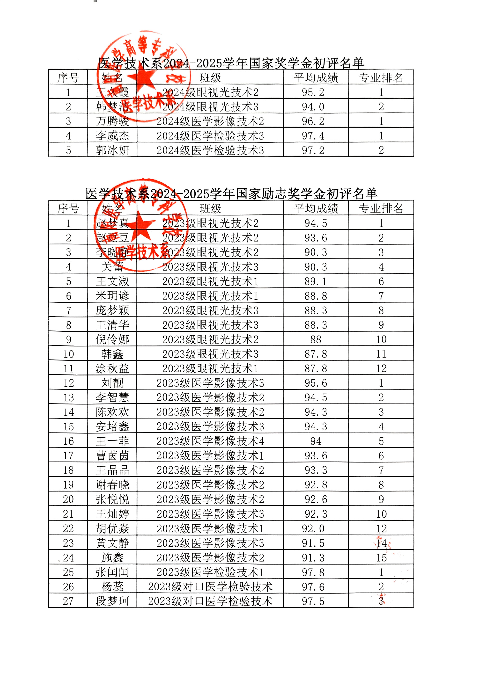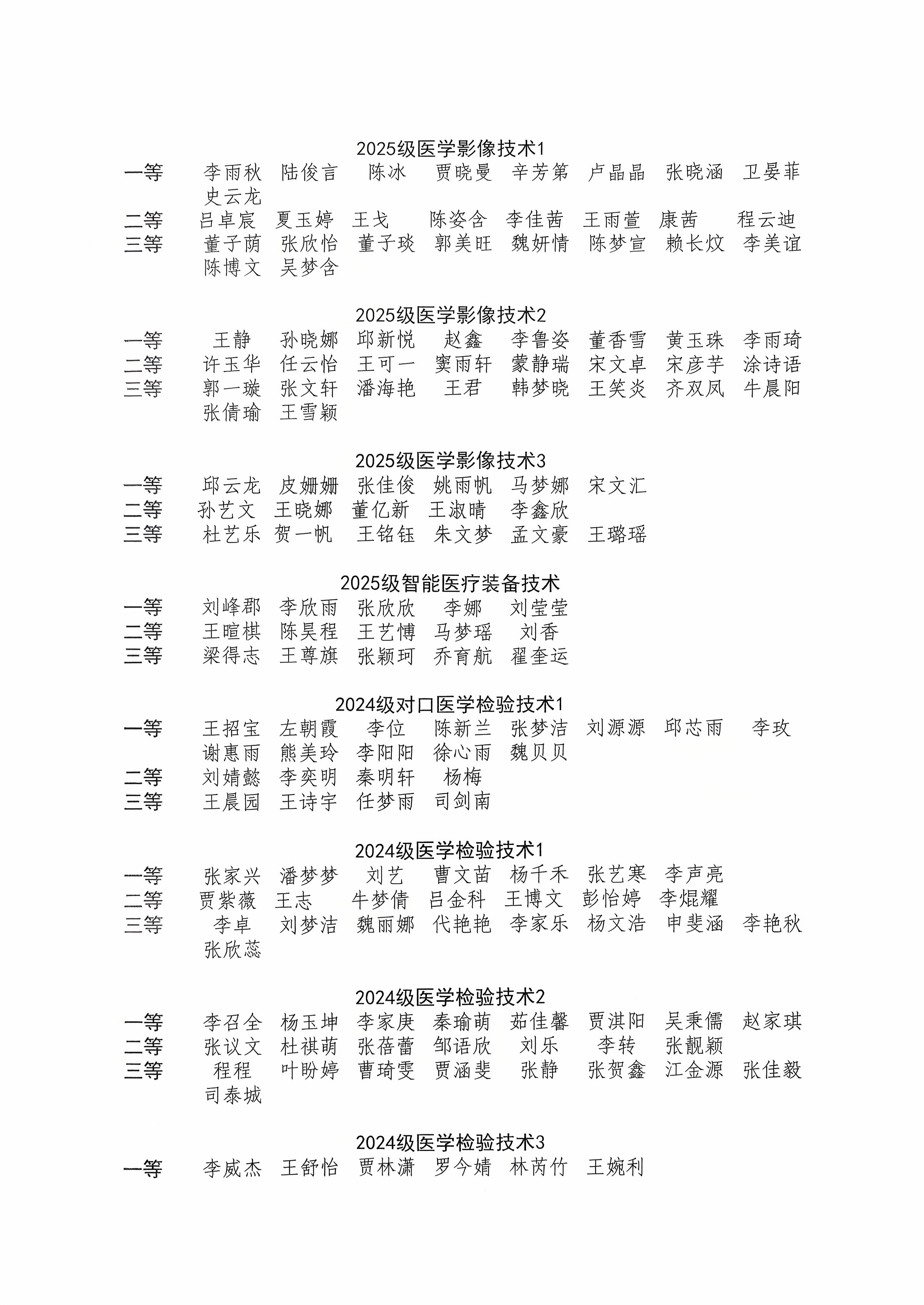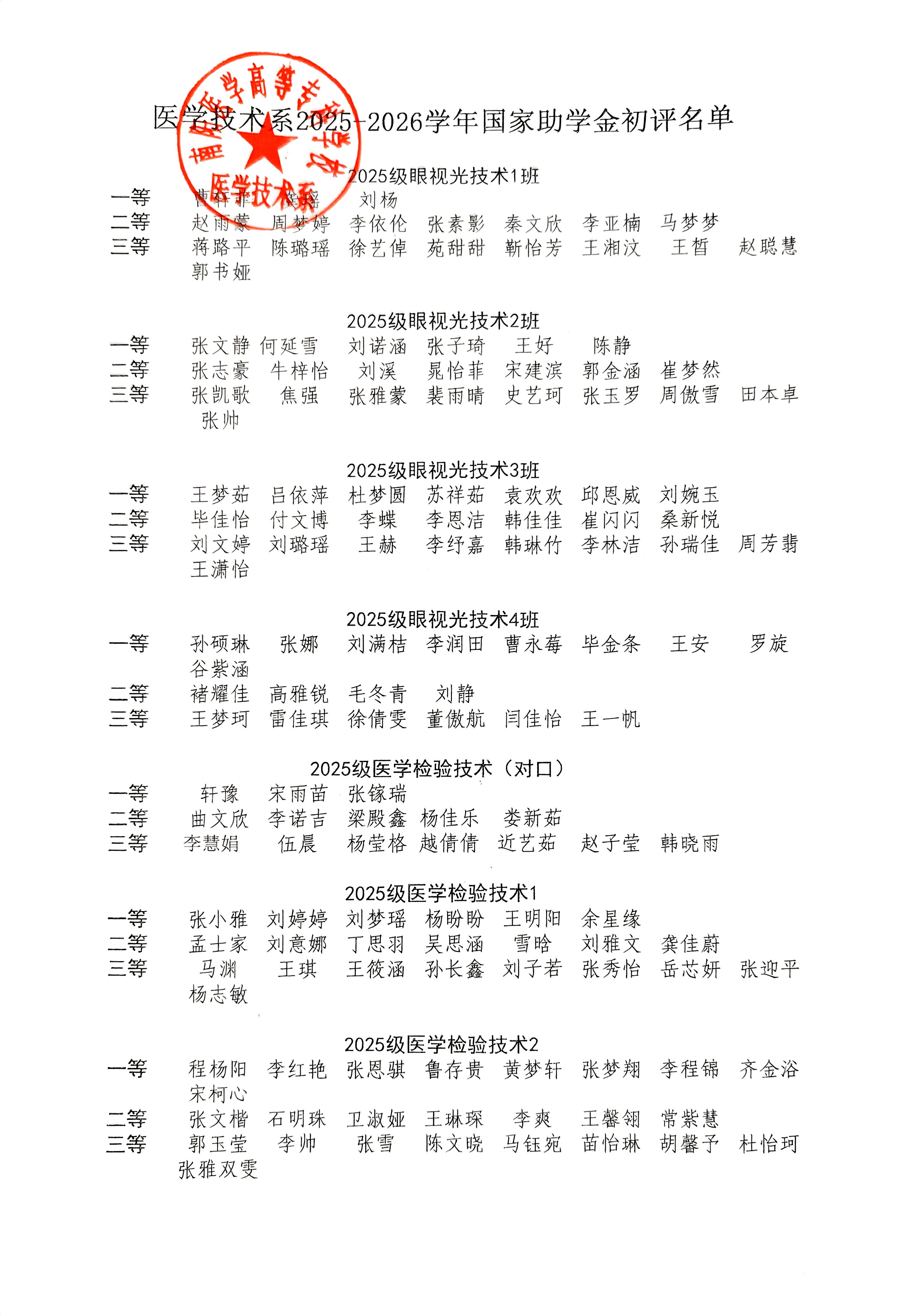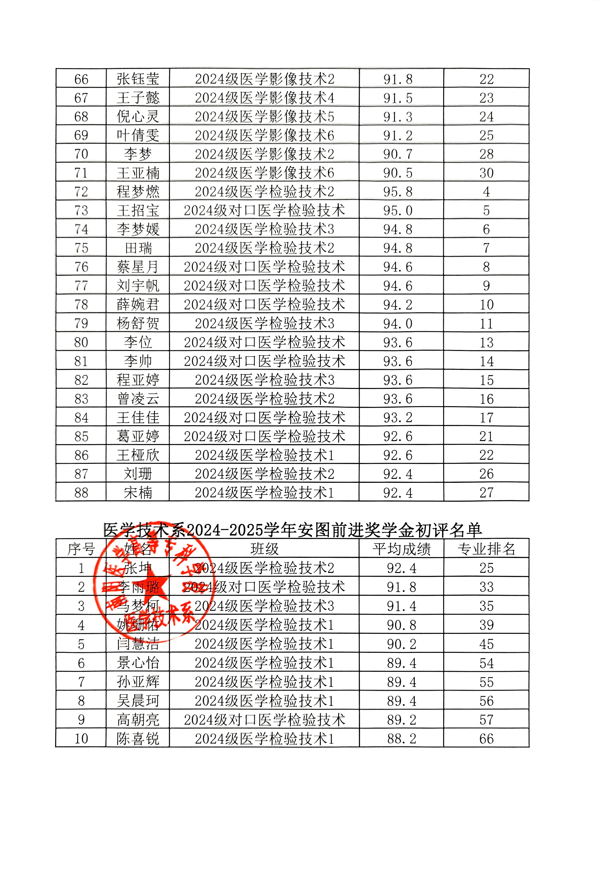 医学技术系2025年各类奖助学金初评结果